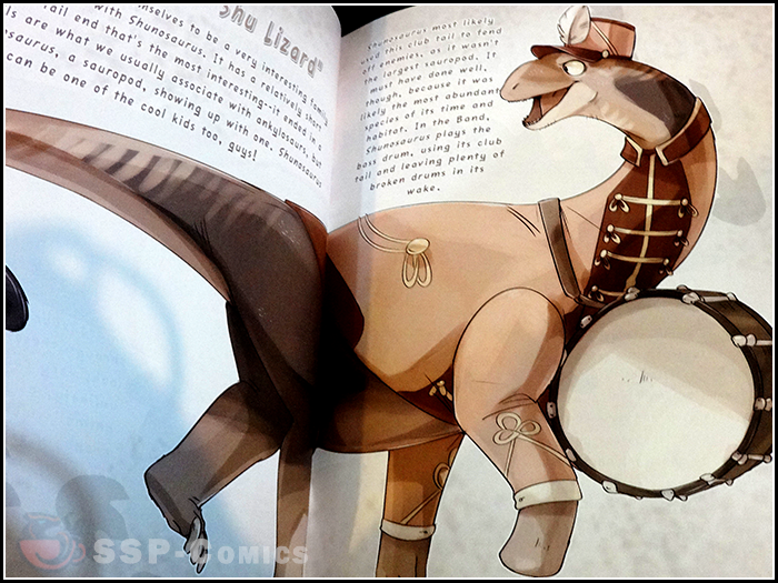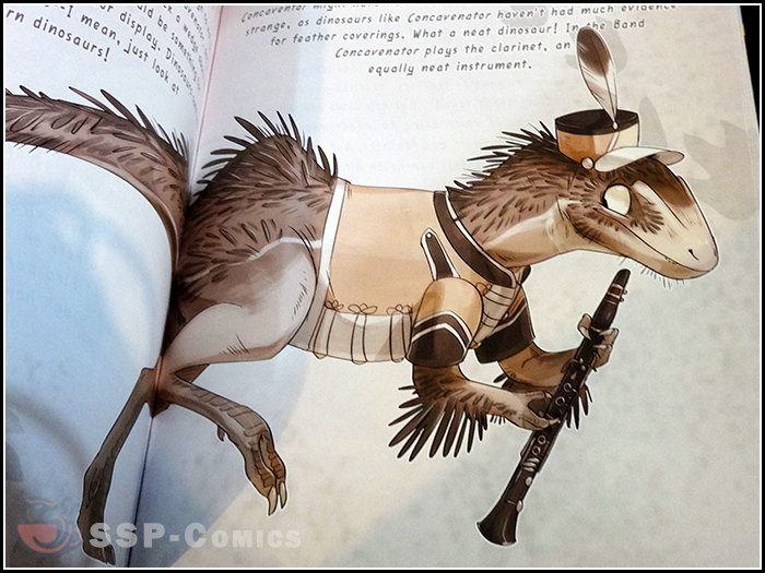 Marching Band of the Dinosaurs contains 20 cute, full spread illustrations of 20 different dinosaur species, and their instruments, as well as a little blurb about them. Although these dinosaurs are stylized, the aim is for them to be up to the current scientific understanding of them–to be seen as the great creatures they were, and not the movie monsters we often see.